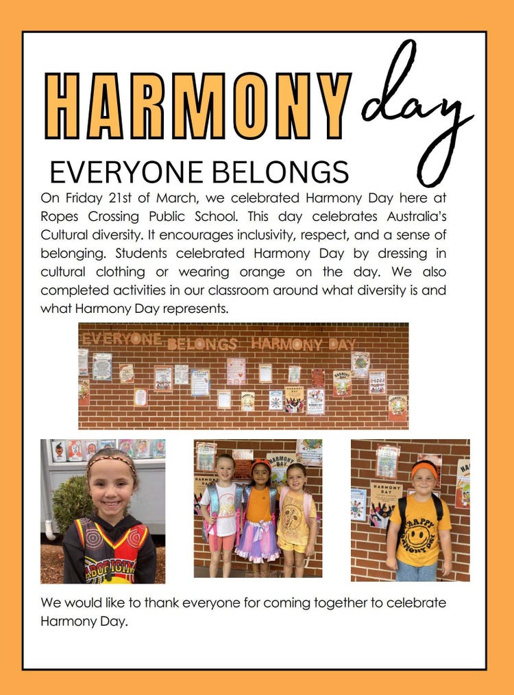 This year at Ropes Crossing Public School we participated in many special days including: Easter Hat parade, Harmony Day, PJ Day, NAIDOC Week, Book Week. Fun Fair and many more.